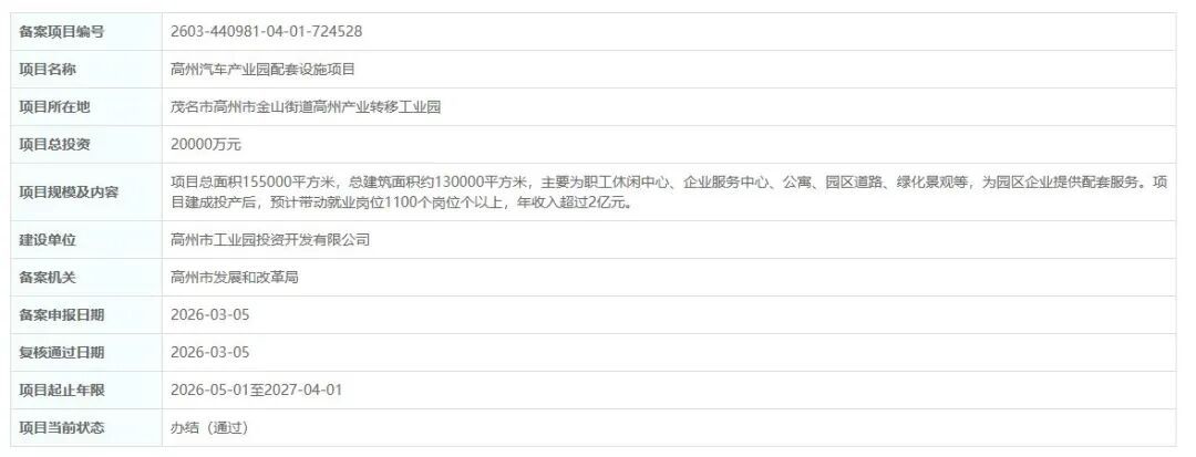 总投资2亿元!高州汽车产业园配套设施项目备案了!
