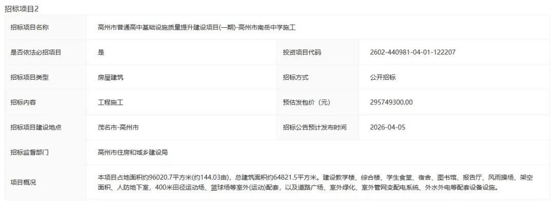 预估发包价近3亿元!高州南岳中学项目即将招标。