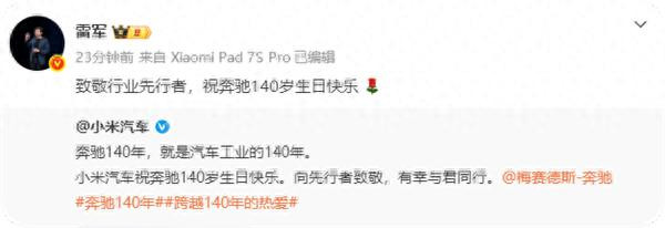 小米汽车官方率先发文表示:“奔驰140年,就是汽车工业的140年。小米汽车祝奔驰140岁生日快乐,向先行者致敬,有幸与君同行。”随后,小米集团创始人雷军也发声,向行业先行者致敬,祝愿奔驰140周岁生日快乐。